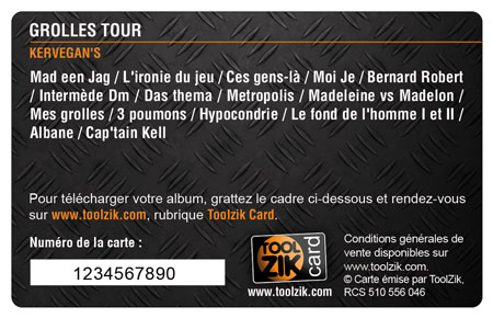 La ToolZik Card est un système code sécurisé qui permet à l’acheteur de télécharger de la musique proposée en ligne par un artiste via son ToolZik Web. Elle se matérialise sous la forme carte en PVC au format carte de crédit, contenant une zone gratter pour obtenir le code.