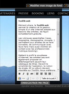 Par défaut, l’artiste a le choix entre une dizaine de fonds prédéfinis. S’il se sent l’âme d’un graphiste, il peut également créer ses fonds en suivant les spécifications techniques ou en téléchargeant un gabarit. Enfin, s’il veut un ToolZik Web vraiment percutant et original, il peut faire appel au service ToolZik Designer où un graphiste professionnel lui proposera des fonds adaptés où l’accent sera mis sur sa sensibilité artistique.