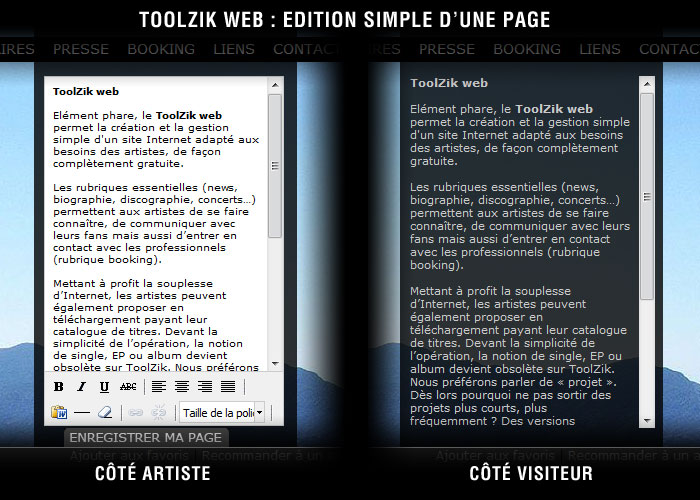 L’inscription sur ToolZik se fait en trois étapes à l’issue de laquelle un ToolZik Web est automatiquement créé. Pour l’éditer, l’artiste doit simplement se rendre sur son espace perso. Parce qu’elle ne requiert aucune connaissance technique particulière, la création et la gestion du ToolZik Web sont donc accessibles à tous.